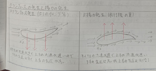 飛行機の翼はダウンフォース発生とは逆の原理で、翼上が負圧の発生。