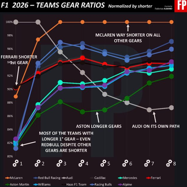 メルセデスは1stギアが長い(広い間隔)、中間ギアも(5th-7th)がMcLarenより1.5-2%長い。全体的にロングギアリングというマクラ―レンとは対照的。
